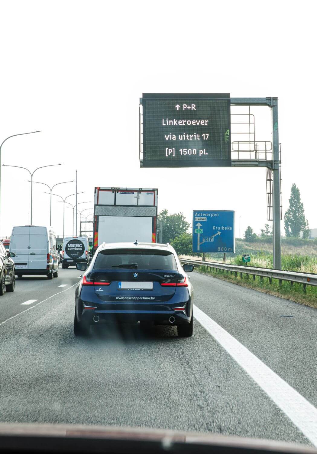 - Hoofdredacteur Jan rijdt met de auto langs de E17 naar de P&R Linkeroever. Daar stapt hij over op de tram.