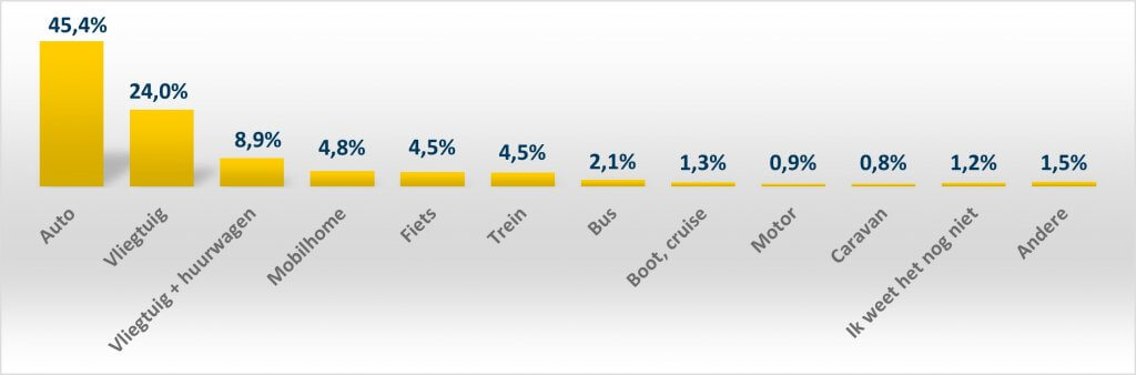 Koning Auto blijft veruit het favoriete transportmiddel. In onderstaande grafiek zien we dat bijna 1 op de 2 Vlamingen (45,4%) deze zomer met de auto op reis gaat. Tellen we daar ook nog de mensen bij die op hun vakantiebestemming met een huurwagen zullen rondrijden of met een mobilhome of caravan op reis gaan, komen we aan 60% Vlamingen die tijdens hun vakantie een vierwieler als transportmiddel gebruiken. 1 op de 3 (32,9%) gaat op reis met het vliegtuig.
