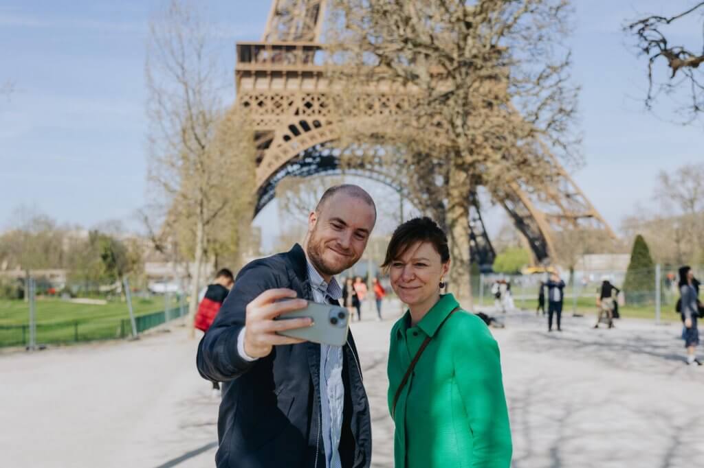 Ellen: Klokslag half 7 trek ik de deur achter me dicht, zwier m’n tas op de achterbank en stel Google Maps in. De navigatie is optimistisch: aankomst om 9u58, of 3,5 uur rijden. Niet slecht voor een rit van 330 km. In de ochtendschemer ga ik op weg. Wanneer ik na anderhalf uur achter het stuur, in de buurt van Lille, via de WhatsApp-functie ‘locatie delen’ kijk waar Mich zich intussen bevindt, blijkt hij ‘nog maar’ in Brussel te zijn. Tijd voor een koffiepauze. De realiteit blijkt me echter letterlijk in te halen: een stuk verder op de A1 zoeft een trein over de snelweg. Een blik op m’n smartphonescherm bevestigt dat dit de trein is waar Mich in zit, want onze locaties bevinden zich vlak bij elkaar. Deze race kan ik niet meer winnen… Gelukkig is het verkeer mild voor me. Vlotjes rijd ik Parijs binnen. Ik hoef dan ook niet diep de stad in, want ik heb een parking gekozen vlak bij de Périphérique. Afklokken doe ik op 10u08 – precies zoals de navigatie voorspeld had, plus een pauze van tien minuten. Om tijd te winnen, vraag ik een Uber-rit aan. Een paar minuten later komt Rachid de straat inrijden. De rit van de oostzijde van Parijs, waar de parkeergarage is, naar het westen van de stad duurt dik 40 minuten. Het is 11u wanneer ik uitstap aan de voet van de Eiffeltoren.