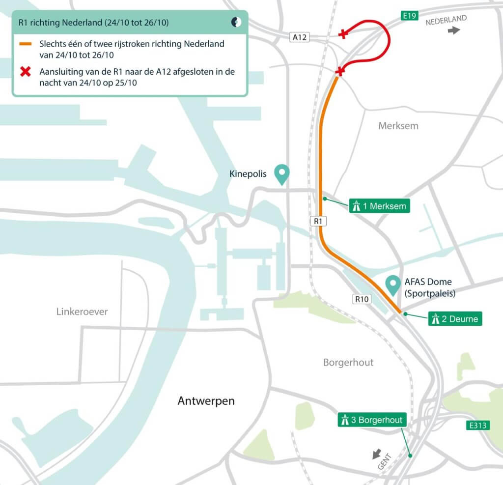 In de nacht van vrijdag 24 op zaterdag 25 oktober is ook de aansluiting van de R1 naar de A12 richting Bergen op Zoom afgesloten. Afrit Merksem blijft tijdens de werken steeds geopend.