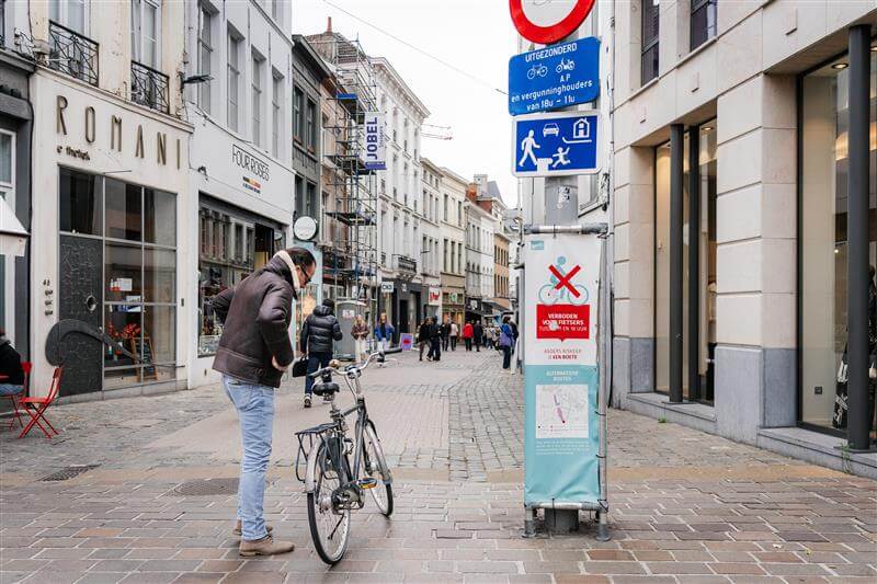 - Fietsers mogen er niet rijden, tenzij anders aangegeven met een onderbord. In het voorbeeld van de foto hierboven in Gent mag er wél gefietst worden, tussen 18 en 11 uur.