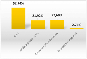 Van de binnenlandse bestemmingen is – net als vorig jaar – de kust de lievelingsstek van de Vlaming. Meer dan 1 op de 2 Vlamingen die in eigen land op reis gaat, trekt naar de Noordzee. Bijna 1 op de 4 trekt naar de Ardennen.