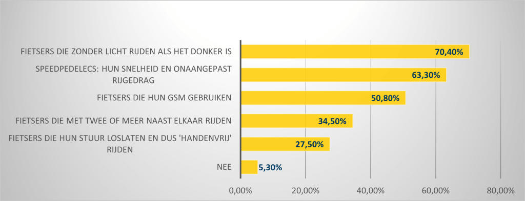 Spitsen we ons even specifiek toe op fietsers, zien we dat liefst 95% van de 3.540 respondenten zich soms ergert aan fietsers en hun gedrag. Grootste ergernis in het verkeer zijn fietsers die zonder licht rijden in het donker, 7 op de 10 Vlamingen ergert zich eraan. Speedpedelecs zorgen door hun snelheid en onaangepast rijgedrag voor frustraties bij meer dan 6 op de 10 Vlamingen.