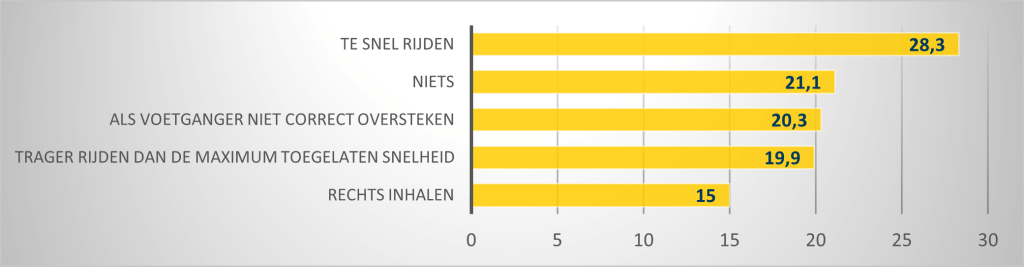 VAB polste in de enquête ook naar ergerlijk gedrag waar we ons zélf soms aan bezondigen. En ook al ergert 1 op de 4 Vlamingen (25%) zich aan snelheidsduivels, geeft ook 28,3% toe zélf soms te snel te rijden. Heel wat Vlamingen geven ook toe soms als voetganger niet correct over te steken (20,3%), trager te rijden dan de toegelaten maximumsnelheid (19,9%) en rechts in te halen (15%).