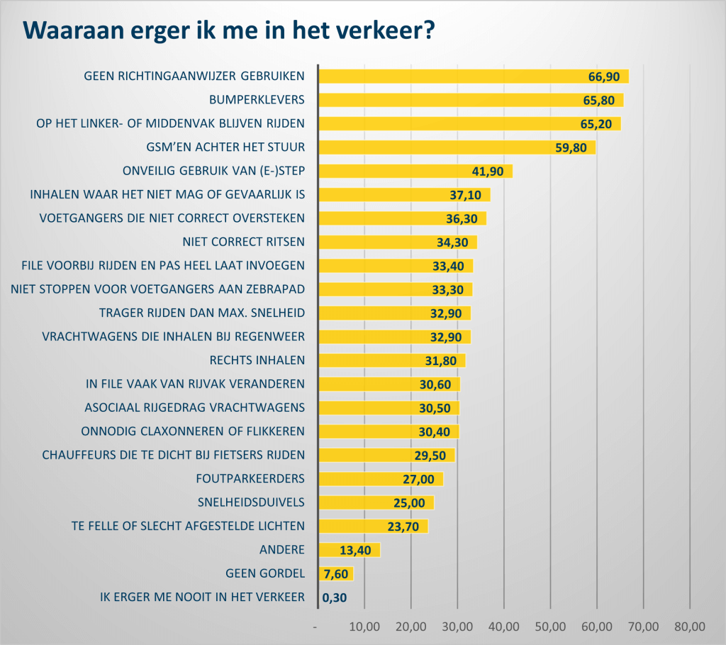 Meest voorkomende ergernis in het verkeer is geen richtingaanwijzer gebruiken (66,9%). Ook aan bumperklevers (65,8%) en chauffeurs die op het linker- of middenvak blijven rijden als er rechts plaats is (65,2%) ergeren we ons blauw. De top vijf wordt aangevuld met gsm’en achter het stuur (59,8%) en onveilig gebruik van (e-)step (41.9%). Nog opvallend is dat quasi iedereen zich wel érgens aan ergert. In Vlaanderen zijn er slechts vier (!) ‘zenmasters’ die zich door niets of niemand laten enerveren.