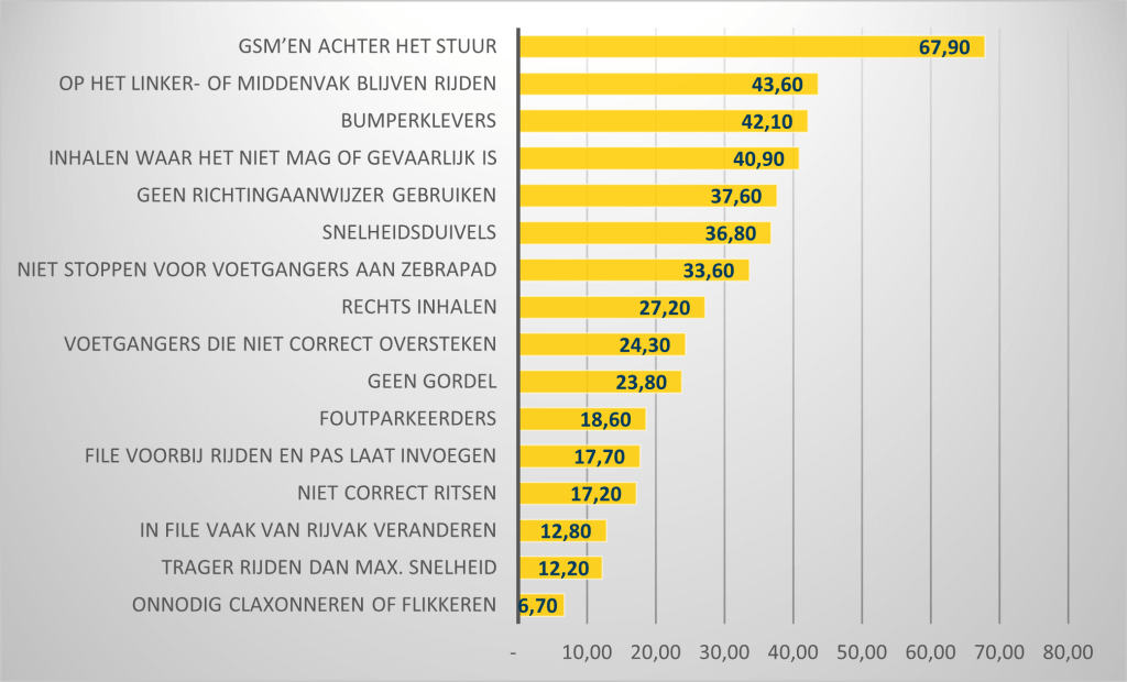3.540 Vlamingen vulden de enquête in die VAB uitstuurde. Daarbij kon men aanduiden of, en zo ja aan wat men zich ergert in het verkeer. 27.936 keer werd een ergernis aangevinkt, of 8 ergernissen per respondent.